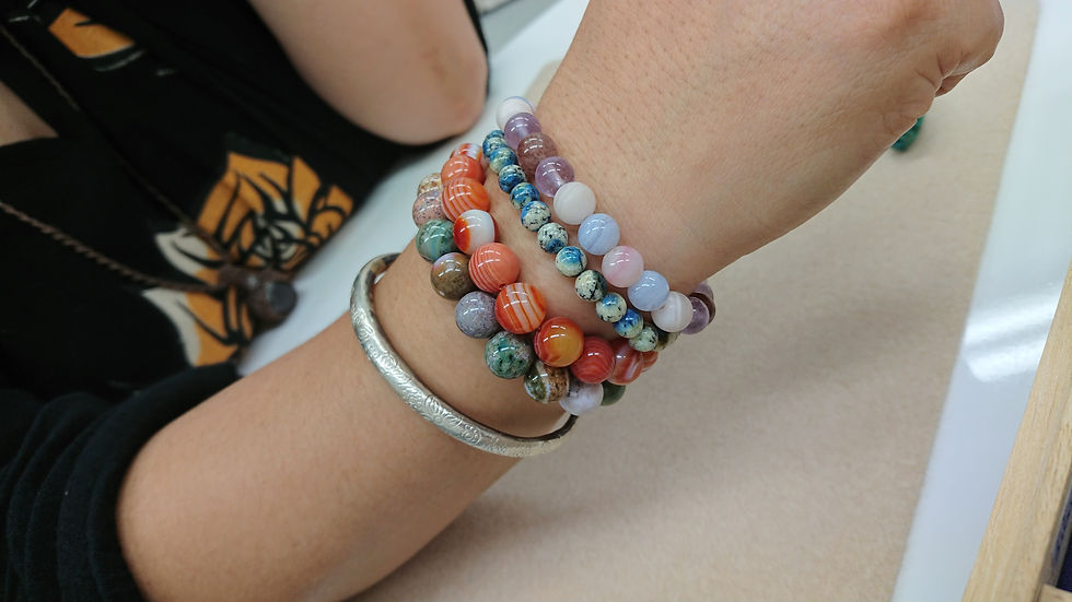 とても石が大好きなお客様😊 いつも大好きな石のお話をするとニコニコ笑顔が止まらない🎶 そんな素敵な彼女の側に行ける石達は幸せだろうな🤗🍀 今回は、前回要らした時にお取り置きしていた 赤白模様の可愛い『サードオニキス』 ブルーと白が可愛い『K2』 予定には入っていなかったけど、めちゃめちゃ可愛い+意味が素敵✨と『オーシャンジャスパー』 💕 いつも大事に身に付けてくださってるブレスレットとの相性もバッチリなので、早速身に付けて帰られました🎵 ブレスレットをつける腕、どちらがいいの?とのご質問があったので、そのお話もしながら楽しい時間を過ごさせて頂きました✨😍✨ 可愛がってもらってね😊💕⤴️ magatamaya.wixsite.com/miyazaki