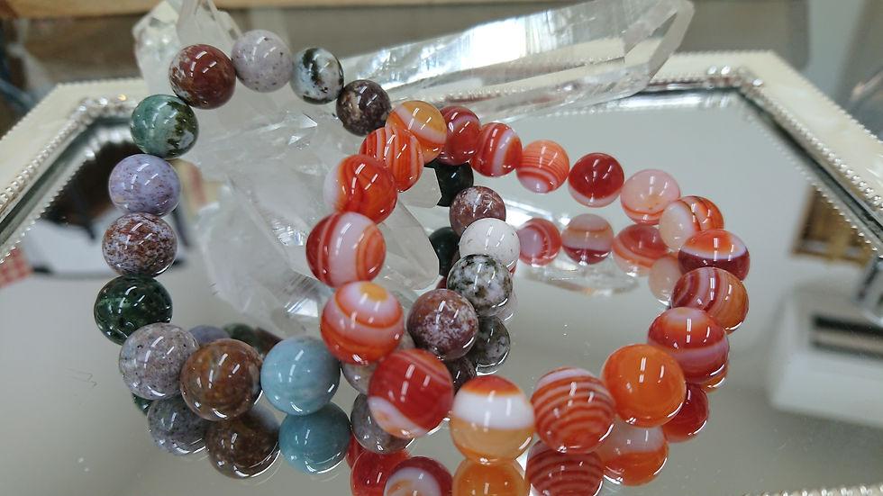 可愛いお孫ちゃんが産まれて、毎日忙しそうなお客様🎶 出勤前に遊びに来て下さいました😊🎶 前回要らした時に、可愛い💕と仰っていた、夫婦の幸福、若さと美しさを保ってくれる『サードオニキス』(赤のしましま模様) 今、合ってるのかな❓ バッチリ合ってますよ😉👌 平和と平穏を招く『オーシャンジャスパー』のブレスレットも一緒に🎶 『サードオニキス』の石の意味に、 家族に囲まれながらも個性的な生き方ができるようになると書かれています⤴️ 自分の時間も楽しまなくちゃ😊🎶 いつもお話を伺っていると、親子の絆がとても深くて、素敵だなぁ🤗💕と幸せな気持ちを頂いています🎶 また、ご家族で要らしてくださいね😉💕