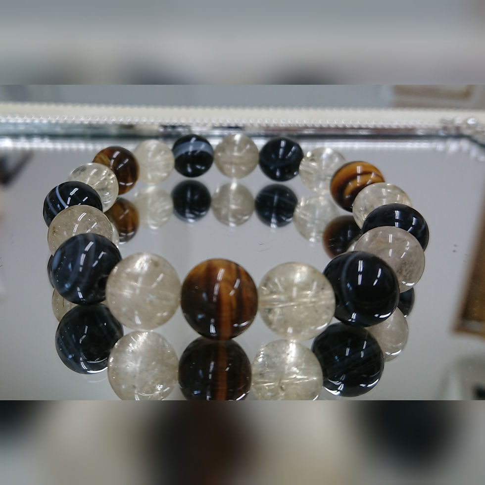 黒のバンテットアゲートに挟まれてる石がルチルクオーツ💕